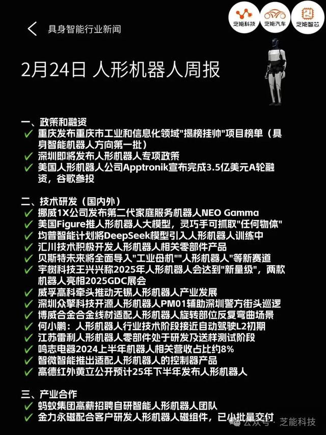 本周人形机器人领域呈现政策、技术、资本多方协同推进的态势。
